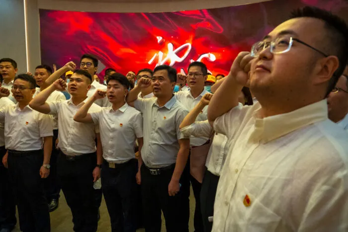 17. Juni 2021 in Shanghai, China: Eidablegung im Gedenkhaus des Ersten Nationalkongresses der Kommunistischen Partei Chinas. Die Gedenkstätte gilt zusammen mit dem Nanhu Red Boat in Jiaxing als Geburtsort der KPCh und ist einer der wichtigsten Orte des sogenannten „Roten Tourismus“.