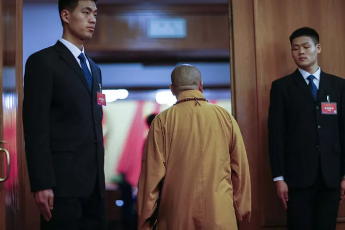 8. März 2017, Peking – Der auch als „CEO-Mönch“ bekannte Abt des Shaolin-Tempels Shi Yongxin (rechts), stellvertretender Vorsitzender der Buddhistischen Vereinigung Chinas und Vorsitzender der Buddhistischen Vereinigung der Provinz Henan, verlässt die Große Halle des Volkes nach der Teilnahme an der 2. Plenarsitzung des Nationalen Volkskongresses.