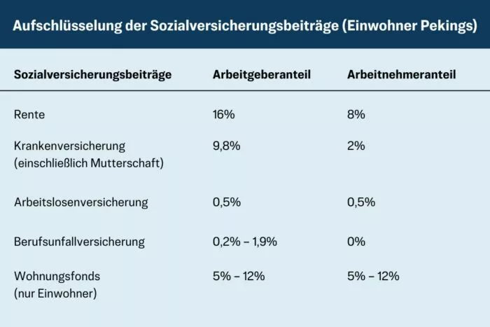 Die Beiträge zu den „fünf Versicherungen und einem Wohnungsfonds“ können je nach Region etwa 40 bis 60 Prozent zum Lohn dazukommen, wobei die Renten- und die Krankenversicherung den größten Anteil ausmachen. Dies geht aus aktuellen Angaben des chinesischen Ministeriums für Personalwesen und soziale Sicherheit hervor.