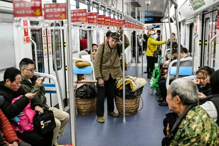 Ein Bauer (M.) benutzt am 5. März 2025 in Chongqing, China, die U-Bahn, um Gemüse zu verkaufen.