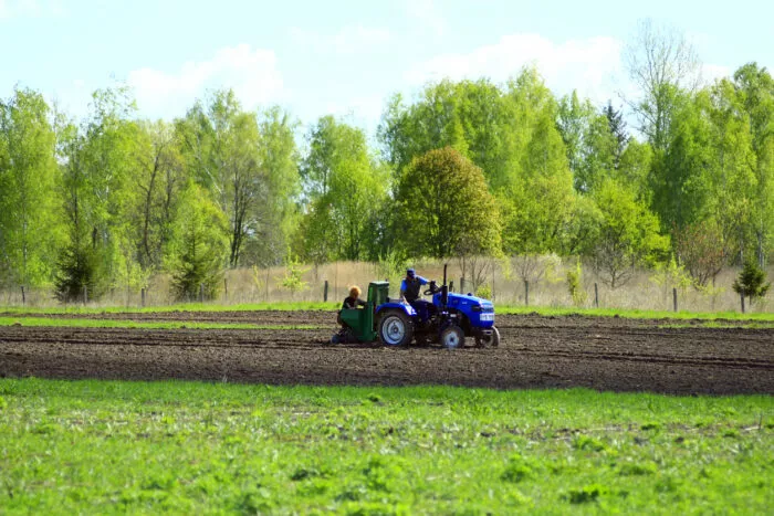 Region Tschernihiw in der Ukraine: Kartoffelanbau mit Traktor und Kartoffellegemaschine.