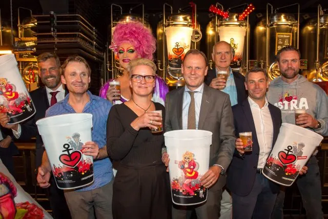 Vorstellung der neuen Mehrweg-Pfandbecher für St. Pauli mit (von links nach rechts): Falko Droßmann (Bezirksamtsleiter Hamburg Mitte), Uli Pforr (Künstler), Olivia Jones (Kiez-Ikone, Gastronomin und Anwohnerin), Julia Staron (Quartiersmanagerin IG St. Pauli), Andy Grote (Innensenator), Michael Garvs (Gesellschafter und Prokurist Klimapatenschaft GmbH), Sebastian Holtz (CEO Carlsberg Deutschland GmbH), Thomas Jankowski (Geschäftsführer Astra St. Pauli Brauerei).
