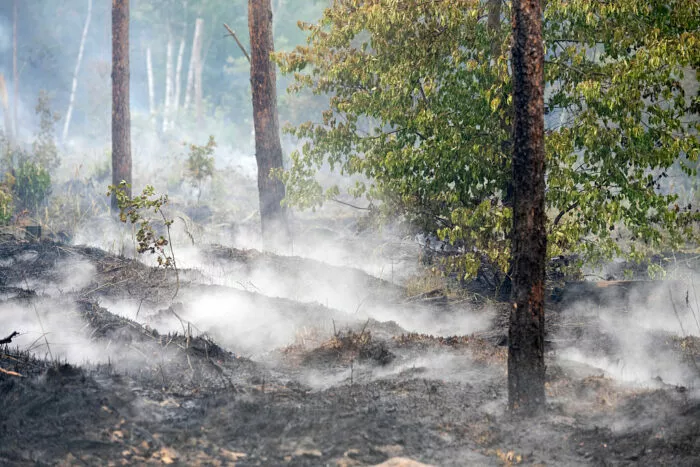 Ein Waldbrand schwelt am 3. Juli 2025 in einem Wald bei Gohrischheide in der Nähe von Zeithain, Deutschland.