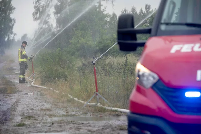 Ein Wasserwerfer der Polizei wird zur Bekämpfung eines Waldbrandes in der Gohrischheide am 3. Juli 2025 in der Nähe von Zeithain, Deutschland, eingesetzt. Die Bewohner von mindestens einem Dorf wurden evakuiert.