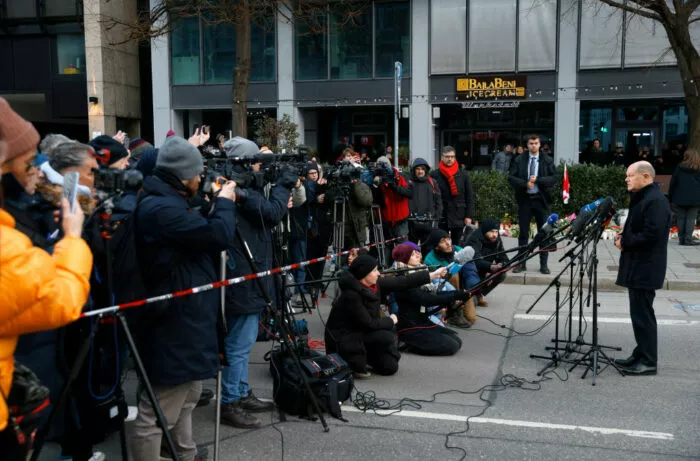 Bundeskanzler Olaf Scholz (r) am 15. Februar 2025 in München. Die Polizei geht davon aus, dass ein afghanischer Mann, der verdächtigt wird, in München ein Auto in eine Menschenmenge gefahren zu haben, möglicherweise islamistisch-extremistisch motiviert war.