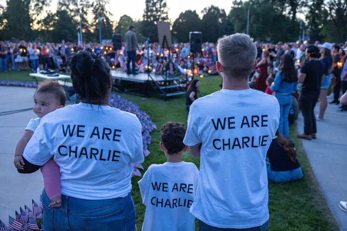 12. September 2025 in Provo, Utah – Menschen tragen T-Shirts mit der Aufschrift „Wir sind Charlie“ während einer Mahnwache für den am 10. September bei einem Attentat getöteten konservativen Aktivisten Charlie Kirk.