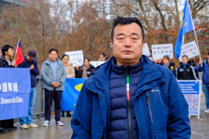 Ehemaliger chinesischer Unternehmer Ruitao Li protestiert vor der chinesischen Botschaft in Berlin.