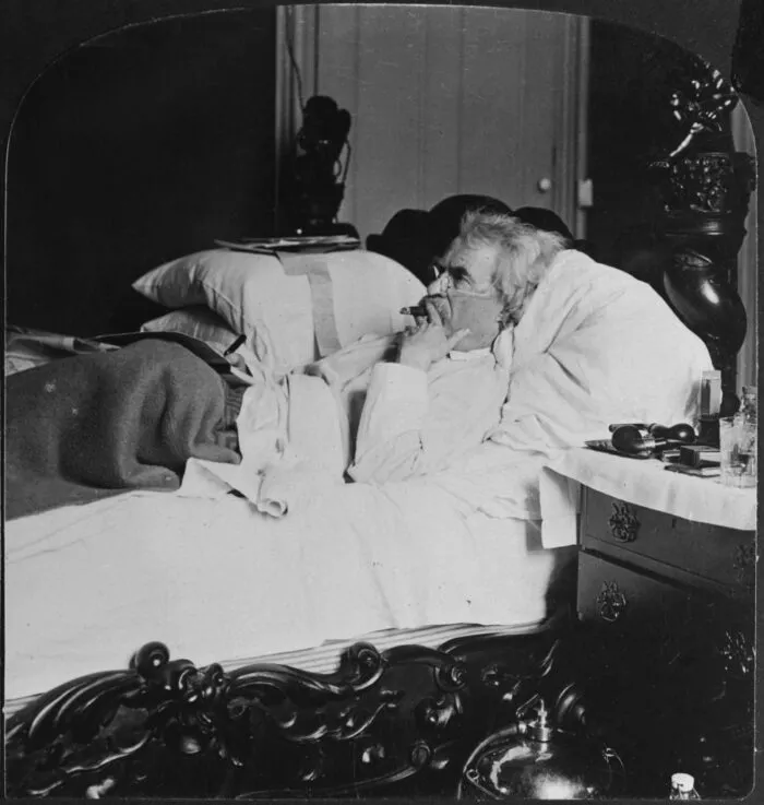 Um 1890 in Hartford, Connecticut: Der amerikanische Schriftsteller und Humorist Mark Twain (1835–1910) liegt in seinem Bett, raucht eine Zigarre und schreibt in sein Notizbuch. Twain erklärte dereinst, einen unregelmäßigen Schlafrhythmus zu haben. Er ging nur zu Bett, wenn er niemanden mehr zum Reden hatte – und stand nur auf, wenn es nötig war.