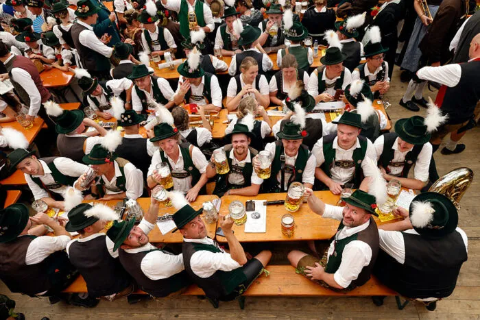 Besucher in traditioneller bayerischer Tracht am 23. September 2025 im Bierzelt auf der Theresienwiese in München.