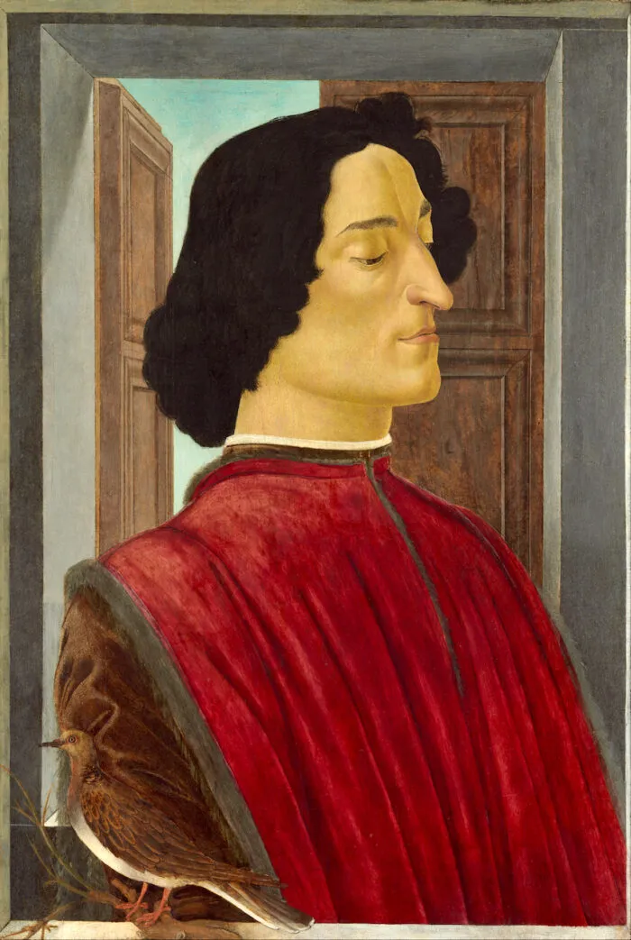 Porträt des Giuliano de’ Medici, um 1478, von Sandro Botticelli. Tempera auf Holz; 57,2 cm x 38,4 cm. Gemäldegalerie der Staatlichen Museen zu Berlin.
