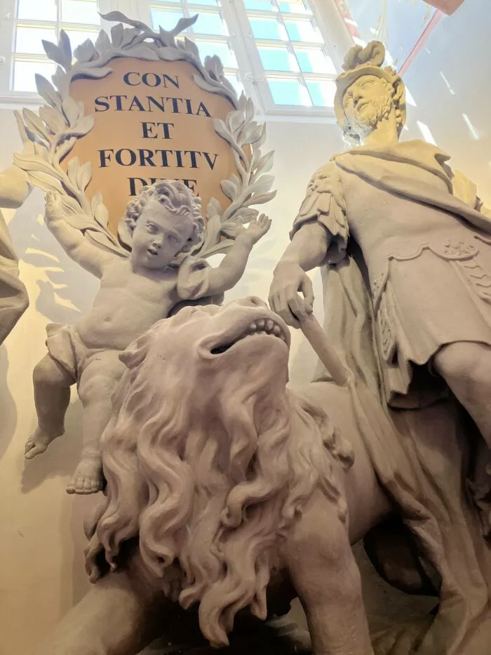Die Inschrift Constantia (Beständigkeit) et Fortitudine (Tapferkeit) auf halber Treppe der Kaiserstiege erinnert an das Motto von Kaiser Karl VI., der dem Kloster sehr zugetan war.