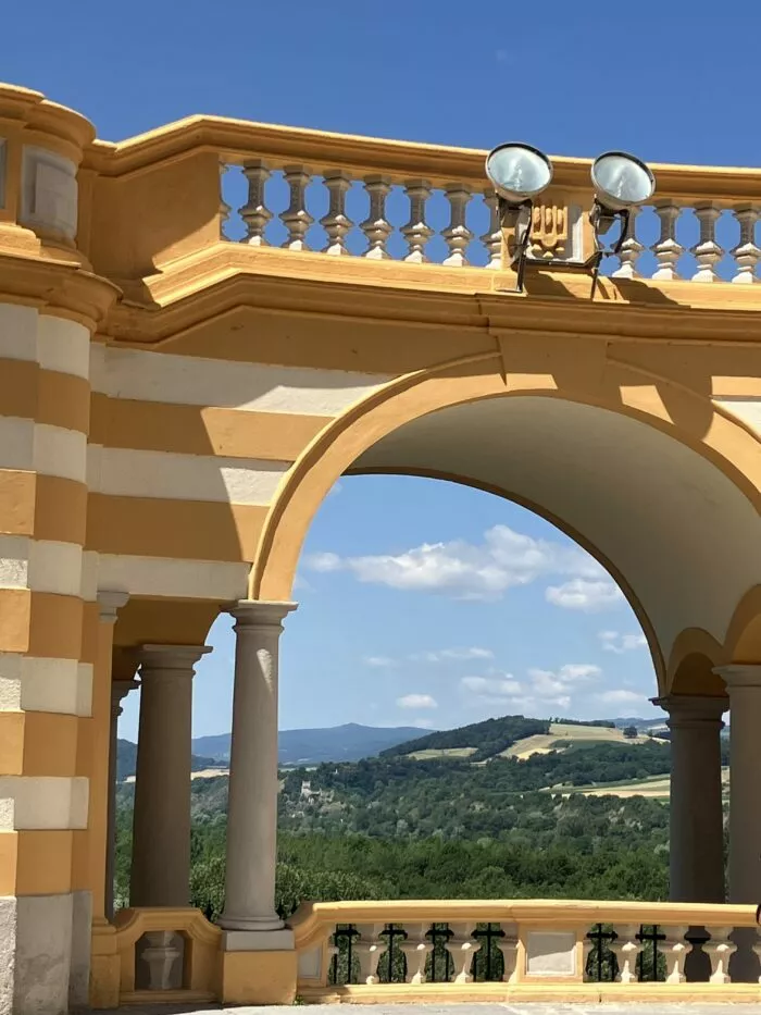 Dann stehen wir unter freiem Himmel auf dem Altan: einer Dachterrasse, die halbkreisförmig die beiden symmetrisch angelegten Flügel verbindet, gleich einer Brüstung sich schützend vor der Stiftskirche wölbt und den Blick weit in die hügelige Landschaft über die Donau hinweg freigibt.