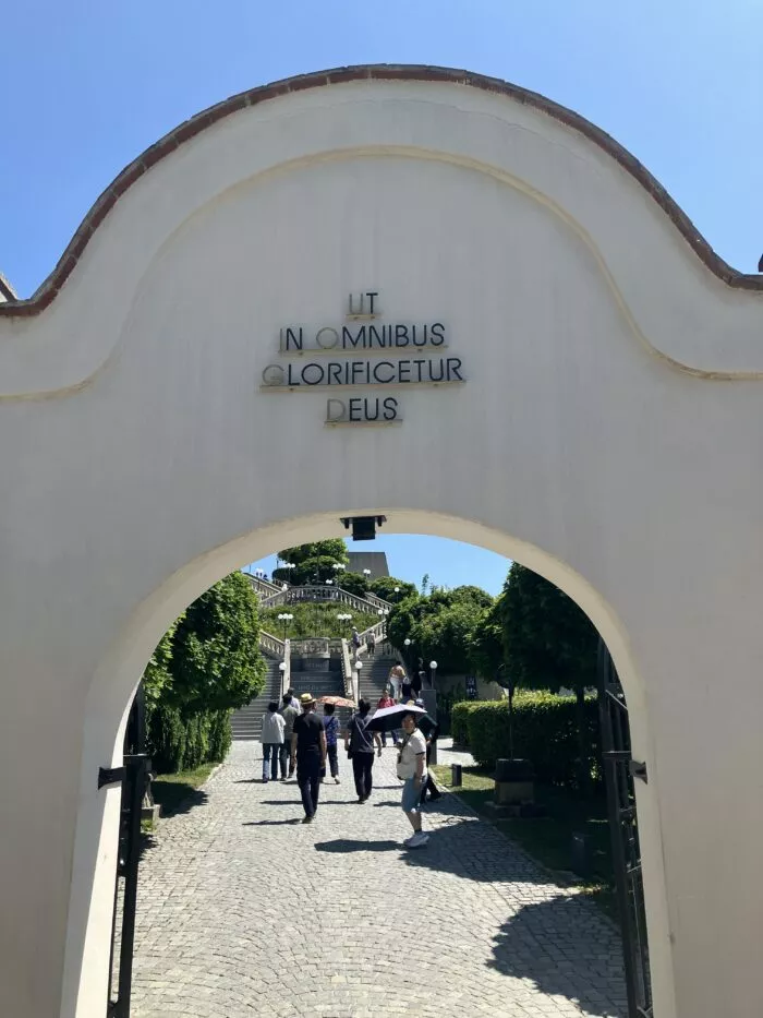 „Ut in omnibus glorificetur Deus“ (Damit in allem Gott verherrlicht werde). Blick auf die Treppenanlage, die in den 1990er-Jahren angelegt wurde und zum Fußballplatz und großen Parkplatz führt.
