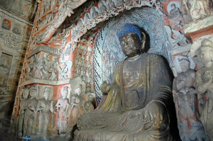 Buddhastatue mit blauen Haaren in den Yungang-Grotten bei Datong, China.