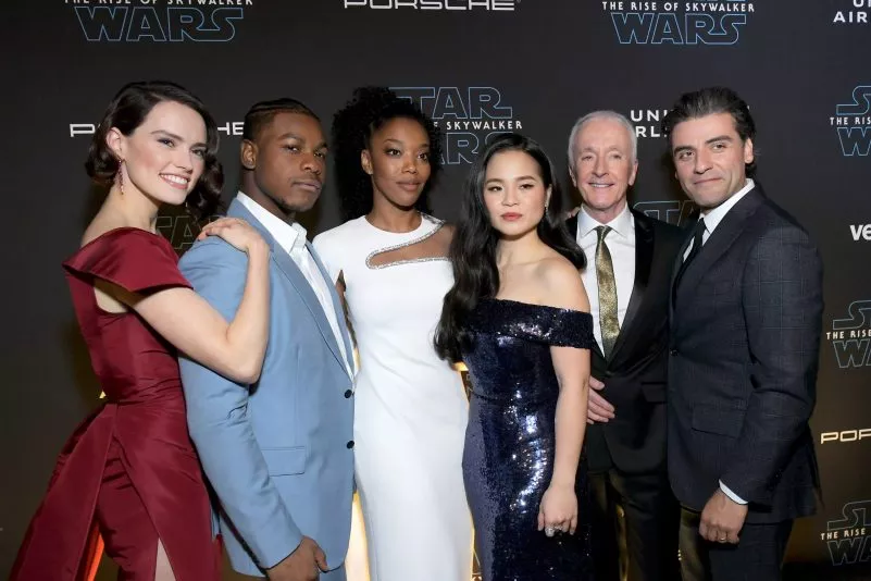 (L-R) Daisy Ridley, John Boyega, Naomi Ackie, Kelly Marie Tran, Anthony Daniels und Oscar Isaac.