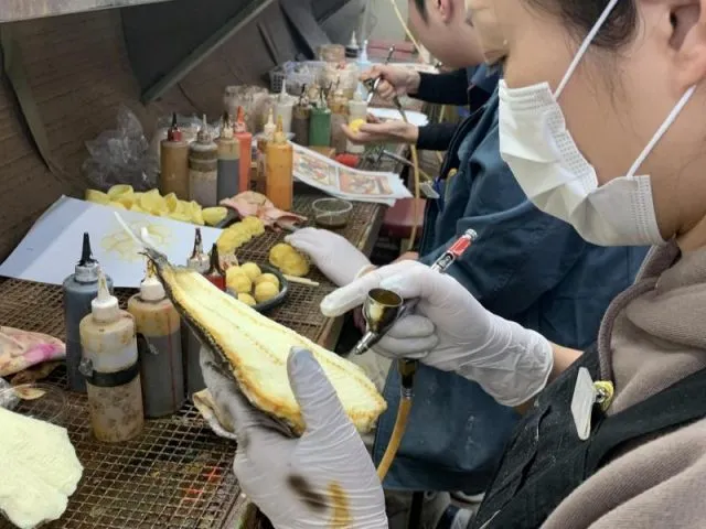 Ebenso kompliziert sieht es bei der Farbgestaltung aus. Die aus Vinylharz hergestellten „Rohlinge“ werden anschließend mit Ölfarben bemalt, und zwar auch hier haargenau so wie die Originalzutaten. Sieht zum Beispiel der gebratene Fisch am Ende zu hell oder zu „verbrannt“ aus, beschwert sich der Kunde. „Wir müssen uns genau die Fotos anschauen“, schildert Miyazawa. Am Ende werde das Ganze noch mit einer glänzenden Glasur überzogen. „Eigentlich hat das echte Essen ja keinen Glanz. Aber wenn man ein bisschen auf die Essen-Attrappen tut, dann sieht das richtig lecker aus“, meint Kurokawa und lächelt.