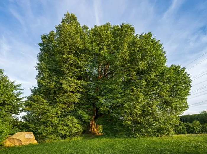 Linde in Schenklengsfeld/Kreis Hersfeld/Hessen: Die vier Stammteile entspringen einem Wurzelstock, dem ein Alter von 1.200 Jahren zugesprochen wird.