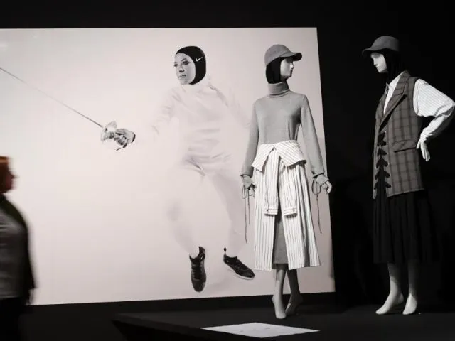Sportbekleidung und ein Nike-Werbefoto, das eine Fechterin zeigt.