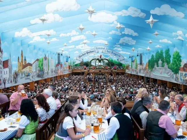 Wiesnbesucher in einem Festzelt unter dem weißblauen Himmel.