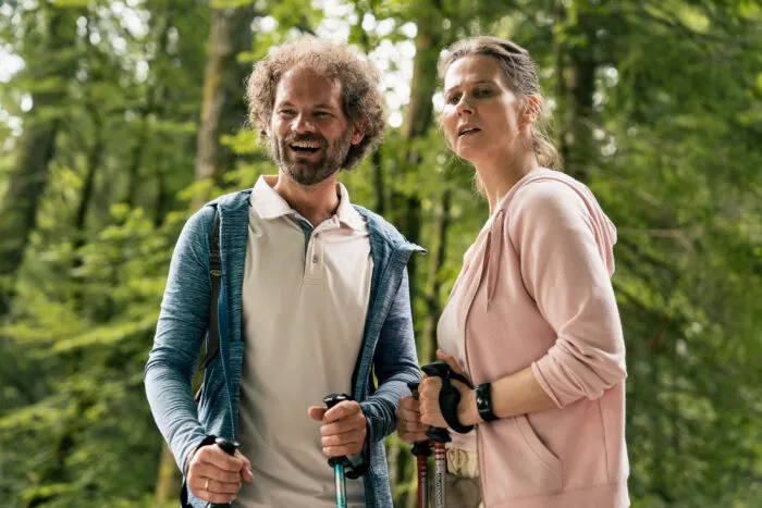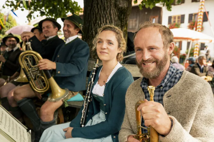 Florian Eder (r., Florian Brückner) und seine Freundin und Arbeitskollegin Tessa aus alten Tagen (Stella Goritzki) spielen gemeinsam in der Musikkapelle auf dem Maifest des Dorfes.