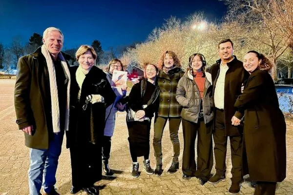 Peter Gaj (erster von l.), Kaufmann in der Forschung, mit seiner Mutter Ursula Gaj (zweite von l.) und sechs Angehörige und Freunde. Sie alle besuchten eine Aufführung von Shen Yun am Abend des 8. Februar in Frankfurt am Main.