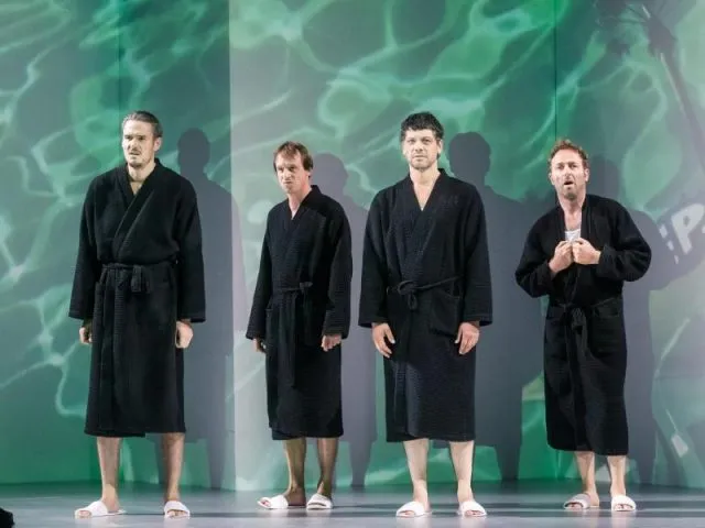 Die Schauspieler Tilman Strauß (l-r), Jan-Peter Kampwirth, Carlo Ljubek und Samuel Weiss treten in Bademänteln auf.