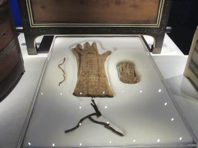 Mit Seidenfaden bestickte Leinenhandschuhe in der Ausstellung «Tutanchamun. Der Schatz des Pharaos». Sie ist seit mehr als 50 Jahren wieder die erste Tutanchamun-Schau in Paris und mit 150 Objekten die bislang größte überhaupt.