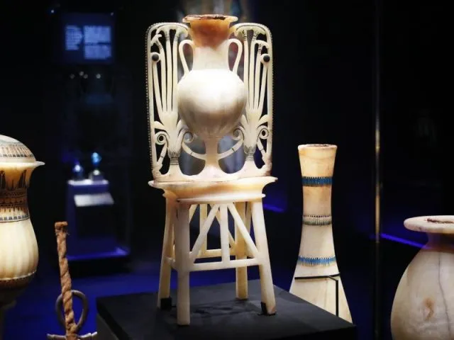 Eine Calcit-Vase mit Papyrus- und Lotusblüten-Design gehört zu den 150 Originalstücken, die in der Ausstellung zu sehen sind.