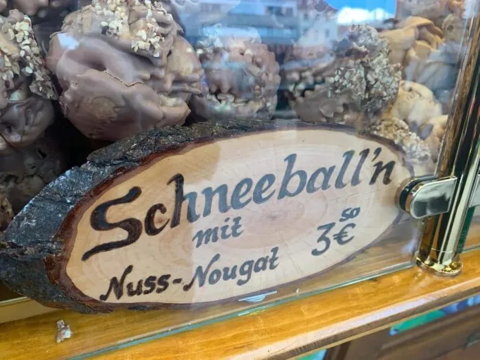 Der Schneeball’n, ein ursprünglich aus Österreich und der Region Hohenlohe-Franken stammendes Mürbeteiggebäck, ist heute auf vielen Weihnachtsmärkten in ganz Deutschland zu finden.