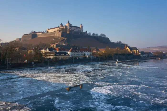 Die Festung Marienberg in Würzburg, aufgenommen am 23. Januar 2017, mit teilweise zugefrorenem Main.