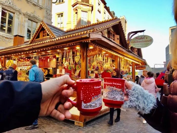 Wir probieren fränkische Weihnachtsplätzchen, essen lokale Wurst und trinken Glühwein: ein heißer Rotwein mit Gewürzen wie Zimt, Nelken und Orangenschalen.
