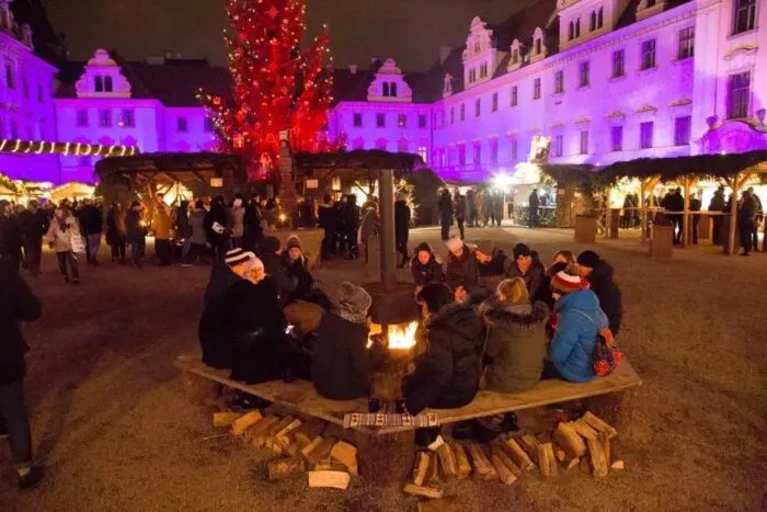 Besonders schön ist er abends. Funkelnde weiße und violette Lichter tauchen die Stände im Schlosshof in ein zauberhaftes Licht. Freundesgruppen sitzen um Feuerstellen, trinken Glühwein und genießen Lebkuchen und Würstchen, während Kinder vergnügt zwischen den Ständen umhertollen.