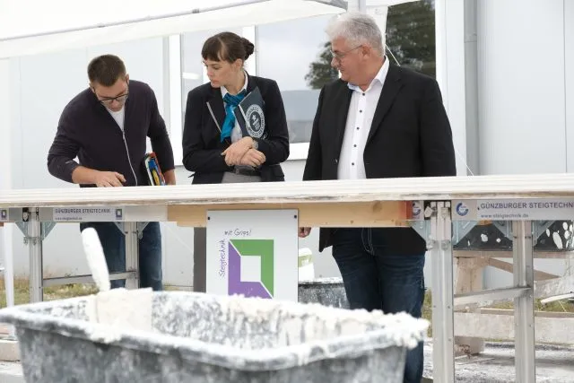 Die Berliner Nachwuchshandwerker Valentin Jentsch (links) und Levin Schulze-Kofalck vom Lehrbauhof Berlin (rechts) mit Ralph Lanz (Rutesheim) vom Nationalteam der Stuckateure. Gemeinsam arbeiten sie am Weltrekord.