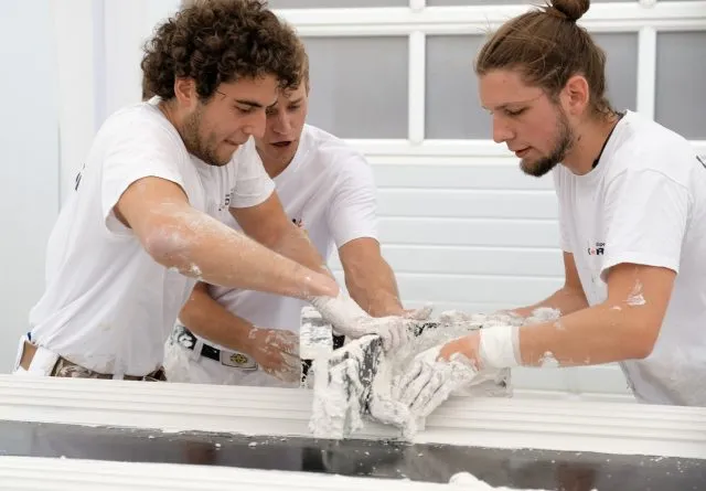 „Wir haben die Abläufe in den vergangenen zwei Tagen beim intensiven Training perfektioniert. Die gemeinsame Vorbereitung hat sich definitiv ausgezahlt“, sagt Ralph Barthelt, Ausbilder für das Stuckgewerbe am Lehrbauhof in Berlin.