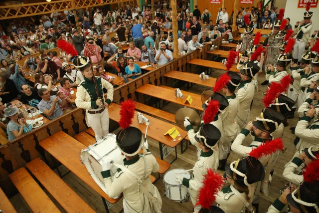 Eine bayerische Marching Band spielt auf im Armbrustschützenzelt.