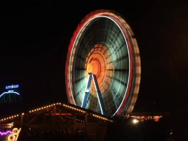 Das Riesenrad und das Käferzelt bei Nacht auf dem Oktoberfest.