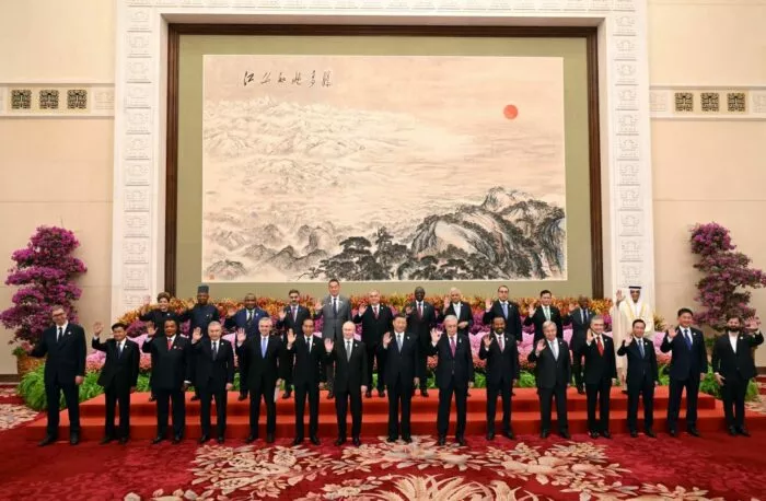 Russlands Präsident Wladimir Putin (7. v. l.) und der chinesische Staatschef Xi Jinping (8. v. l.) am 18. Oktober 2023 in Peking – sowie Vertreter, die am dritten Belt and Road Forum teilnehmen.