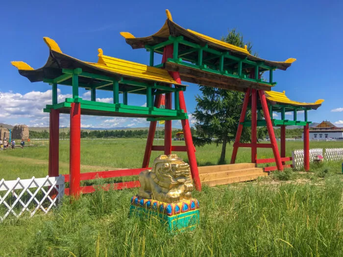 Chadan in der südöstlichen Republik Tuwa, Russland: Der farbenfrohe Eingangsbogen eines neuen Ustuu-Huree-Tempels. Die Einwohner sind überwiegend tibetische Buddhisten.