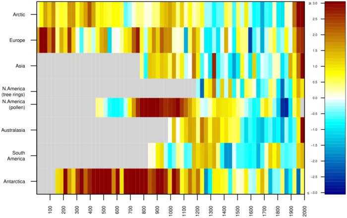 Ferner kommen die Forscher zu dem Schluss, dass, global betrachtet, die „flächengewichtete durchschnittliche rekonstruierte Temperatur“ im Zeitraum 1971–2000 höher lag „als zu jedem anderen Zeitpunkt in fast 1.400 Jahren“. Betrachtet man die Kontinente einzeln, lassen die Daten diese Aussage indes nicht zu.