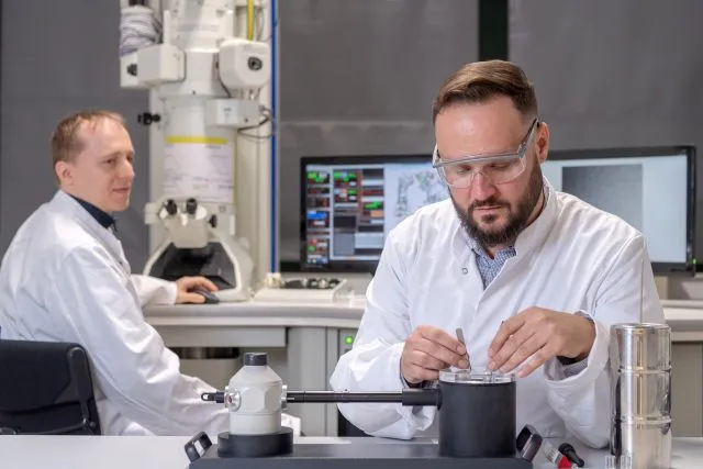 Dr. Christoph Kaiser (rechts) beim Transfer eines Kryo-Proteinpräparates und Dr. Carsten Peters (links) an einem Transmissionselektronenmikroskop.