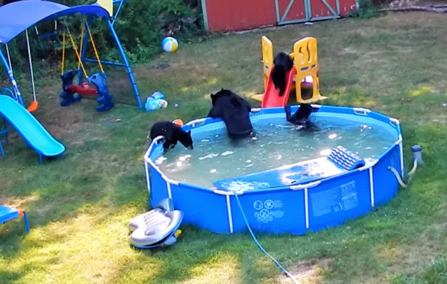 Wenn die Sonne die Staaten erreicht, packen Familien und Freunde ihre Badeanzüge ein und reisen an verschiedene Orte ans Wasser. Einige Menschen fahren ins Ausland, um dort das Wetter zu genießen. Andere bevorzugen die lokalen Strände. Oder, wenn Sie diese Bärenfamilie sind, genießen Sie die Gärten und Hinterhöfe anderer Leute.