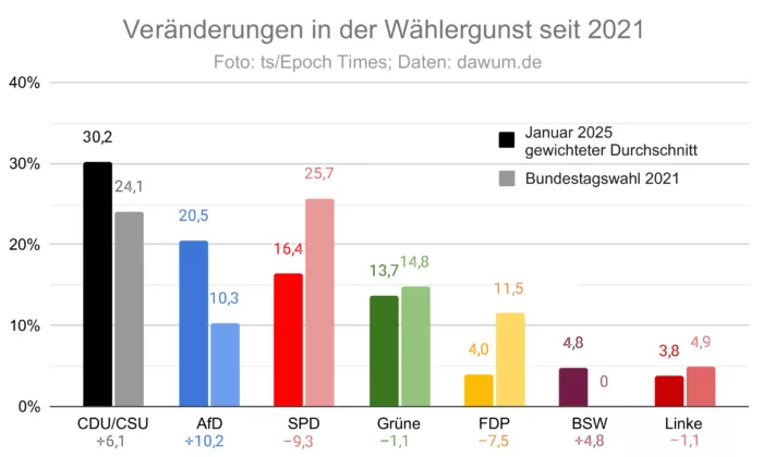 Seit der Bundestagswahl 2021 konnte die AfD ihre Wählerschaft nahezu verdoppeln. Das neu gegründete BSW erreichte aus dem Stand knapp unter 5 Prozent und liegt vor FDP und Linke. Die größten Verluste mussten SPD und FDP hinnehmen, wobei letztere nahezu zwei Drittel ihrer Wähler verlor.