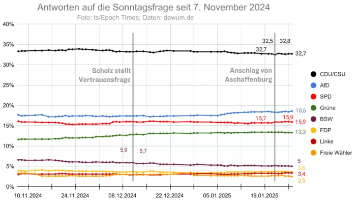 Wenn schon am nächsten Sonntag ein neuer Bundestag gewählt würde, läge die Union wieder bei 30 Prozent. Das geht aus einer Online-Umfrage hervor, die das Meinungsforschungsinstitut INSA im Auftrag der „Bild“ zwischen dem 24. und 27. Januar 2025 unter 2.006 Befragten erhoben hatte. Im Vergleich zur vorausgegangenen INSA-Umfrage vom 20. Januar, vor dem Anschlag von Aschaffenburg, bedeutet das ein Plus von einem Prozentpunkt für die gemeinsame Fraktion von CDU und CSU.