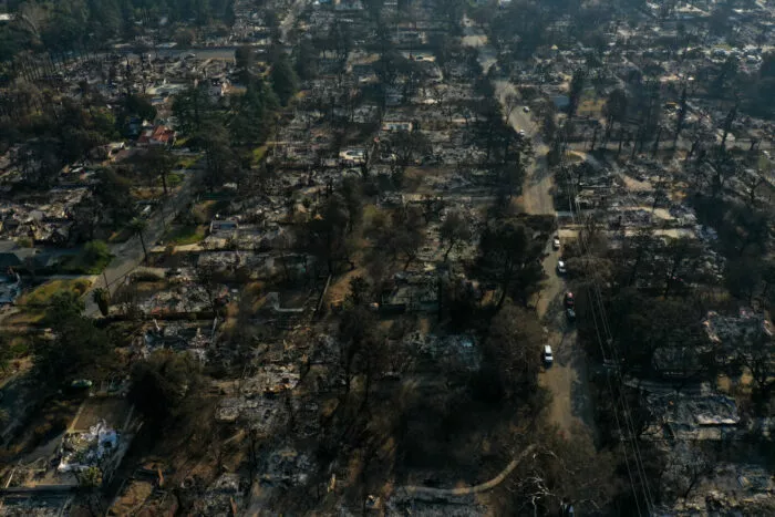 Luftaufnahme zeigt die ausgebrannten Überreste zahlreicher Häuser im Altadena-Viertel von Los Angeles.