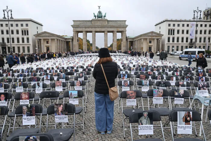 Zudem wurden am Vormittag rund 1.100 Stühle in Gedenken an die Opfer aufgestellt. Einige Stühle sollen dabei ganze Familien symbolisieren. Abends sollen die Worte „Bring them home now“ auf das Brandenburger Tor projiziert werden. Damit wird gefordert, die verbliebenen Geiseln freizulassen.