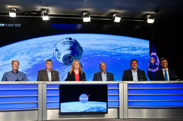 (L-R) NASA-Administrator Bill Nelson, NASA Commercial Crew Program Manager Steve Stich, die leitende Wissenschaftlerin des Internationalen Raumstationsprogramms der NASA, Jennifer Buchli, der Programmmanager des Commercial Crew Program von Boeing, Mark Nappi, der Vizepräsident für Regierungs- und kommerzielle Programme der United Launch Alliance, Gary Wentz, und der Wetterbeauftragte Brian Cizek vor dem Start des ersten bemannten Raumschiffs von Boeing, dem Boeing Starliner.