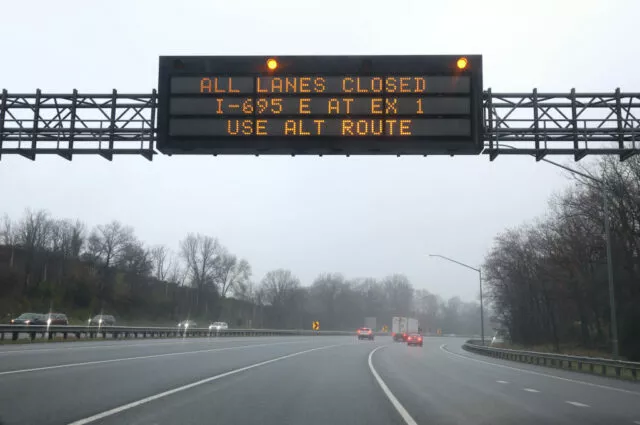 Ein Schild weist Autofahrer auf die Sperrung der I-695 nach dem Einsturz der Francis Scott Key Bridge hin. Die Brücke wurde täglich von rund 30.000 Menschen genutzt wird. Der Hafen von Baltimore, einer der größten und verkehrsreichsten an der Ostküste der USA, ist vorübergehend geschlossen.