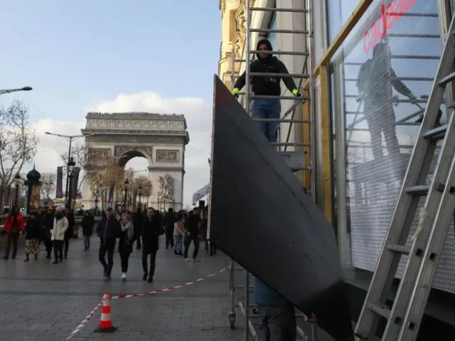 Ein Arbeiter montiert einen Schutz am Schaufenster eines Geschäfts in der Nähe des Arc de Triomphe in Paris.
