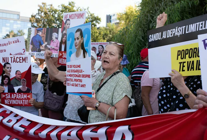 Während einer Demonstration in Chisinau am 16. August 2025. Eine Teilnehmerin hält ein Porträt der ehemaligen Herrscherin der autonomen Region Gagausien in Moldawien, Evgenya Gutul, die kürzlich zu sieben Jahren Haft verurteilt wurde. Rund 300 Menschen nahmen an einer regierungsfeindlichen Demonstration teil. Zuvor versprach der flüchtige moldauische Oligarch und Straftäter Ilan Shor in den sozialen Medien „ein Monatsgehalt von 3.000 Dollar für alle, die auf dem Großen Nationalversammlungsplatz in Chisinau gegen die Regierung protestieren”. Shor rief am 16. August 2025 dazu auf, Zelte aufzubauen, um das Zentrum von Chisinau lahmzulegen, und bot ihnen dafür das Zehnfache des Mindestlohns in Moldawien.