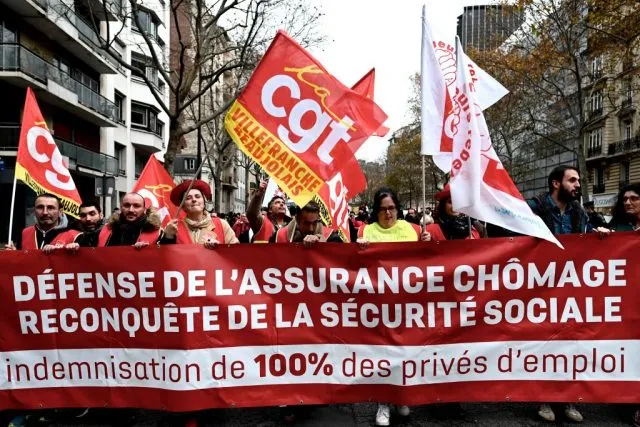 „Verteidigung des Arbeitslosengeldes, Wiedererlangung der sozialen Sicherheit“ bei einer Demonstration am 7. Dezember 2019 in Paris.